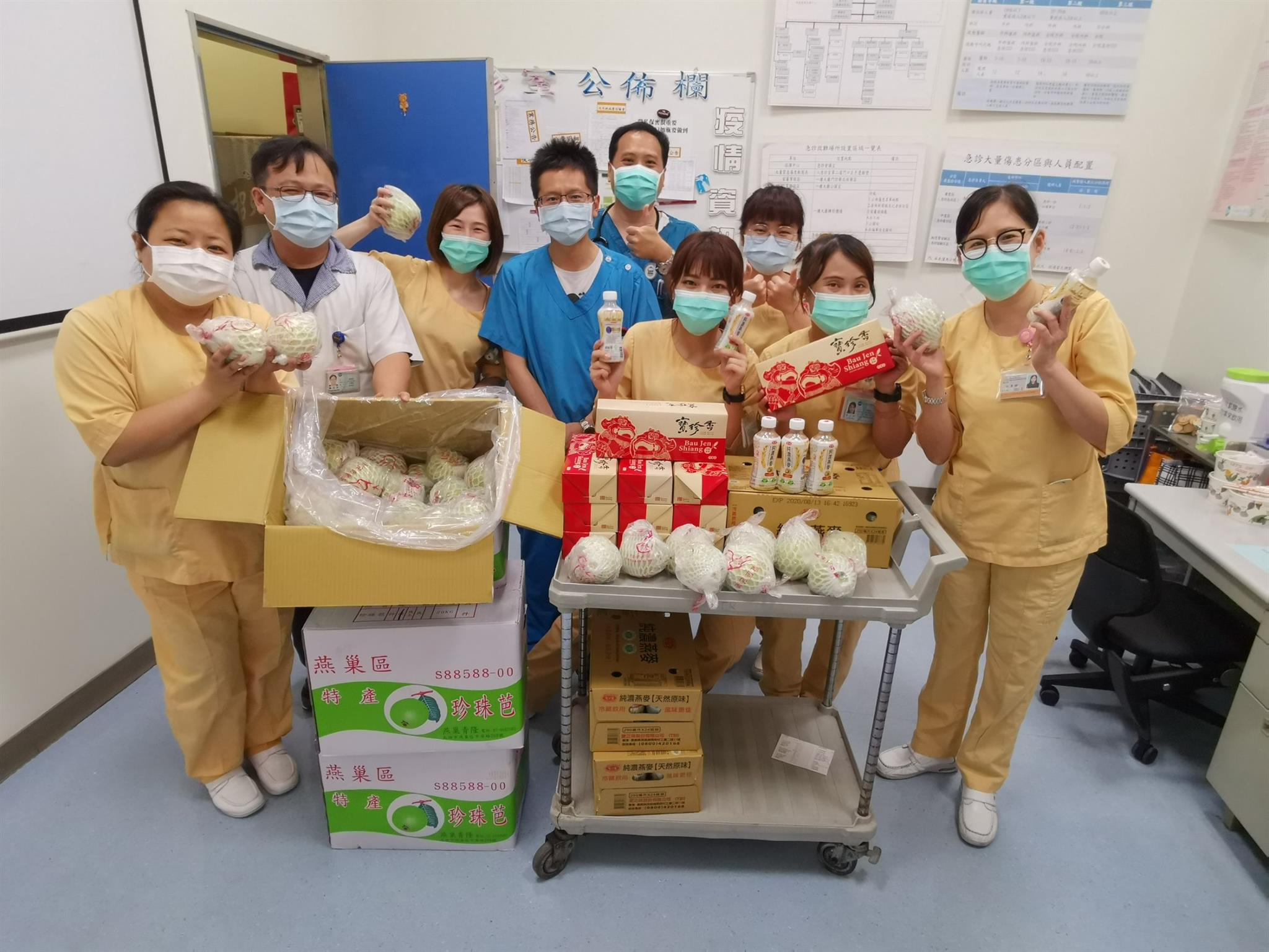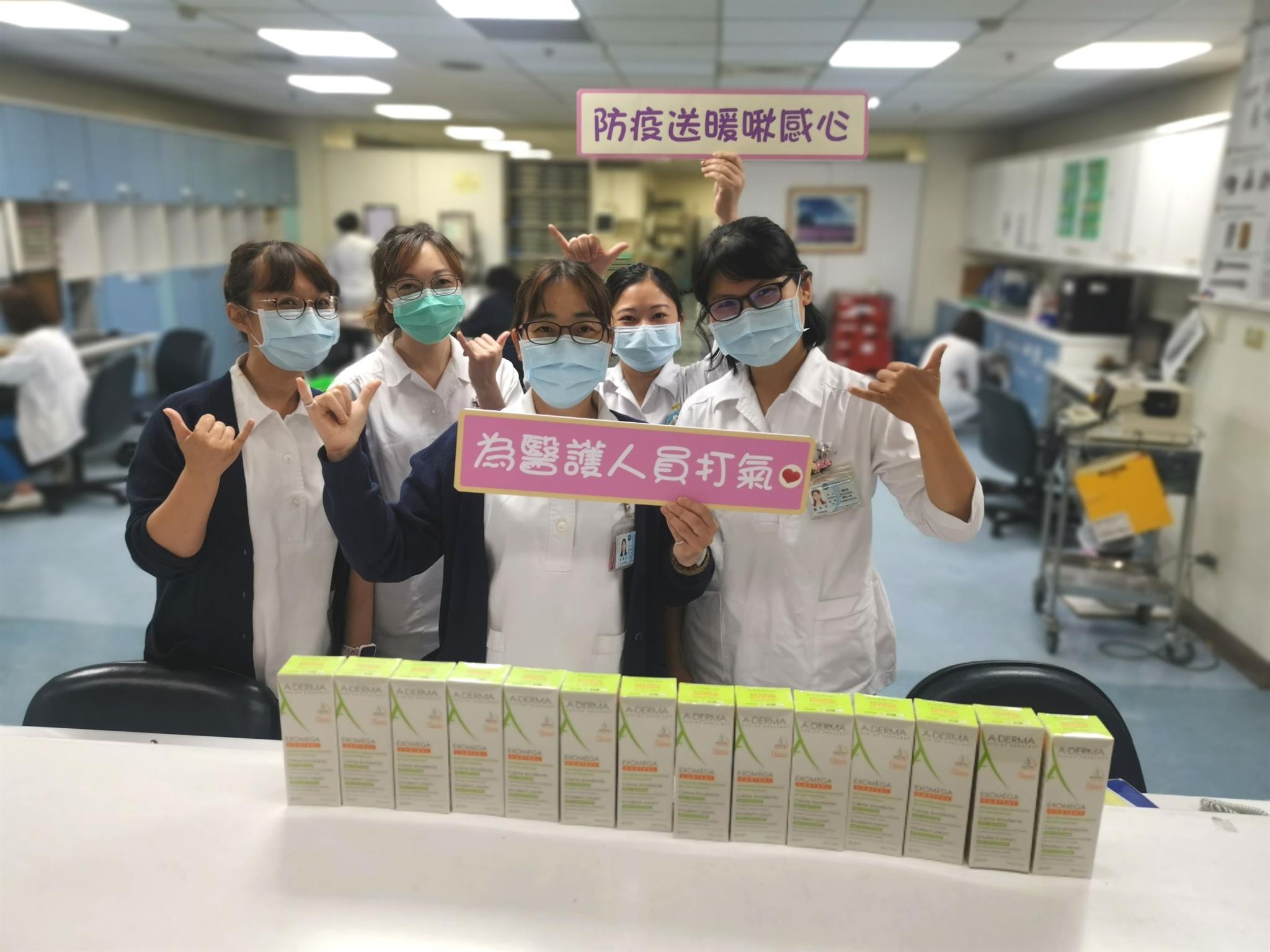 不只小朋友送來貼心禮物,還有許多院內及院外如雪片般飛來的慰勞也讓醫護人員備感溫馨。廖仁董事長和郭振華院長體恤一線同仁必須重複洗手清潔,所以贈送一線同仁每人一條護手霜,呼籲大家保護雙手共同防疫;另有社會各界捐款及自發性贈送餐點來加油打氣,包括:便當、燉湯、水果、飲料和蛋糕,每位醫護人員都是「吃在嘴裡暖在心裡」,希望大家共同攜手度過防疫難關。