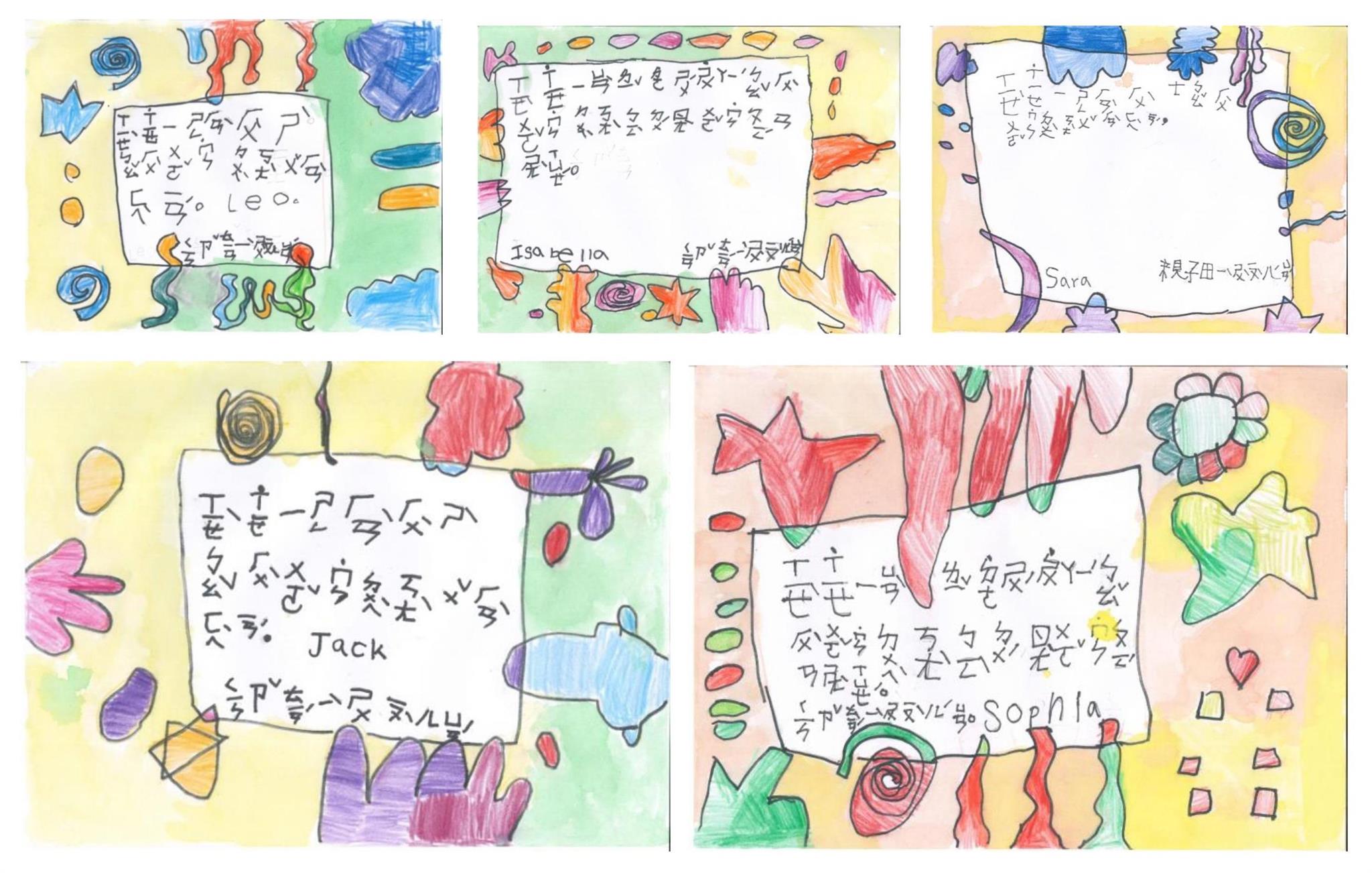 這五張手繪卡片的用色繽紛亮眼,四周點綴著許多可愛圖案,正中央內容寫著:「謝謝醫院裡的叔叔阿姨保護我們,對抗病毒,讓我們平安上學」,文末分別有Sara、Sophia、Leo、Isabella和Jack的簽名。雖然是用注音符號書寫,但是童言童語為新冠肺炎疫情抗疫加油,謝謝醫護人員辛勞,薄薄的卡片上滿滿都是孩子們最真誠的心意。