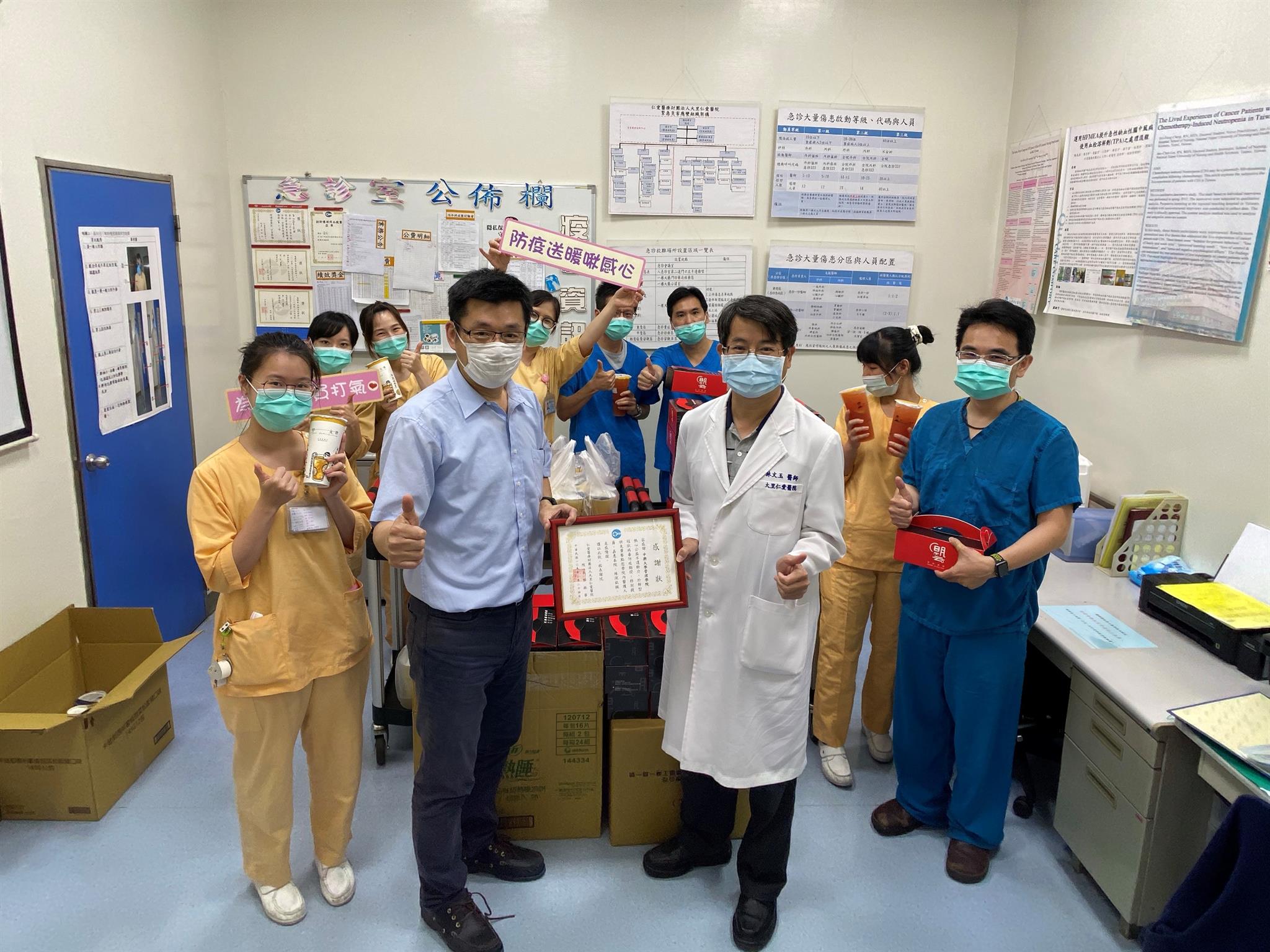 郭振華院長表示,感謝防疫期間院內所有同仁協助防疫,以及各界對醫護人員的支持和鼓勵。這次防疫為了配合政策,從防疫物質統一控管限制配送使用、醫事人員管制出國等等,為此不但取消今年度員工旅遊,甚至有同仁將蜜月旅行規劃取消,對大家的影響比較大,但還是會盡量給同仁一個友善工作環境,在合理情況下照顧到每位同仁的需求。防疫工作任重而道遠,需要每位同仁認真付出、盡心地配合,不是一個人或一個單位就能獨自完成的,希望所有同仁都能相互合作,共同抗疫、堅守崗位,持續守護周邊地區民眾的健康。