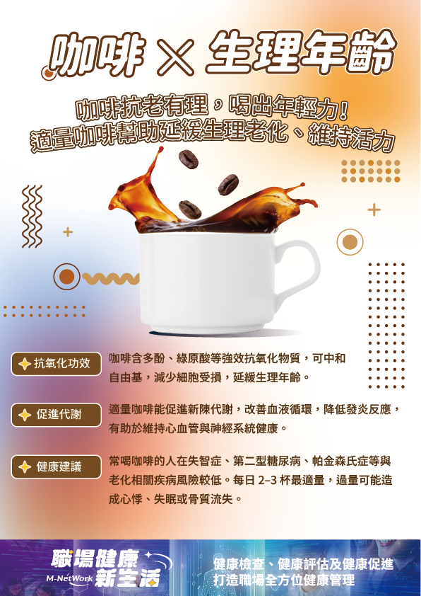 延伸小知識:咖啡中的多酚、綠原酸具備抗氧化功能,適量飲用(每日 2–3 杯)不僅能提神,更有助於延緩老化。