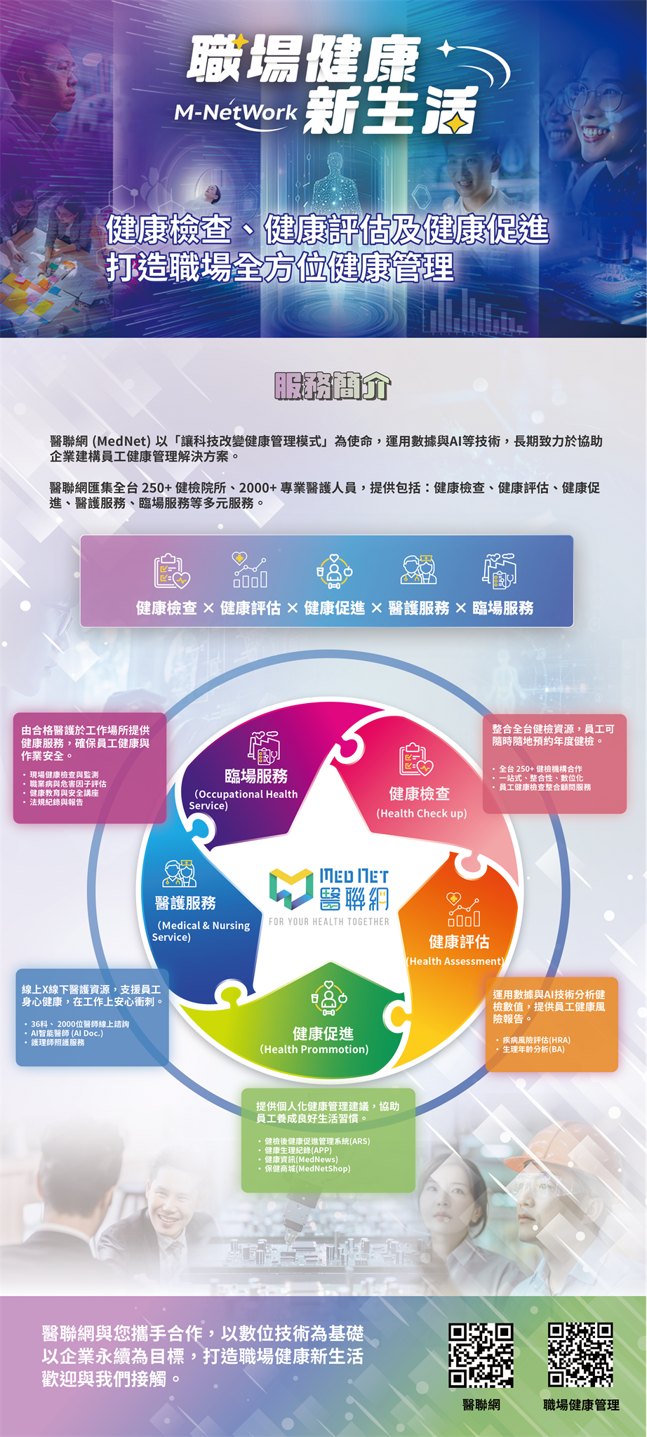「職場健康新生活(M-NetWork)」:一站式、數位化服務方案,從健康檢查、健康評估到健康促進,打造企業員工全方位健康管理。