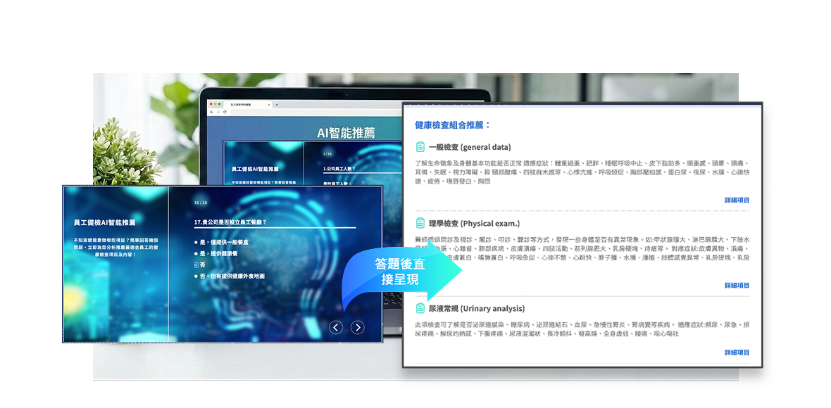 生理紀錄APP、生理量測設備、臨場健康服務、遠距醫師諮詢等完整健檢後續服務。
